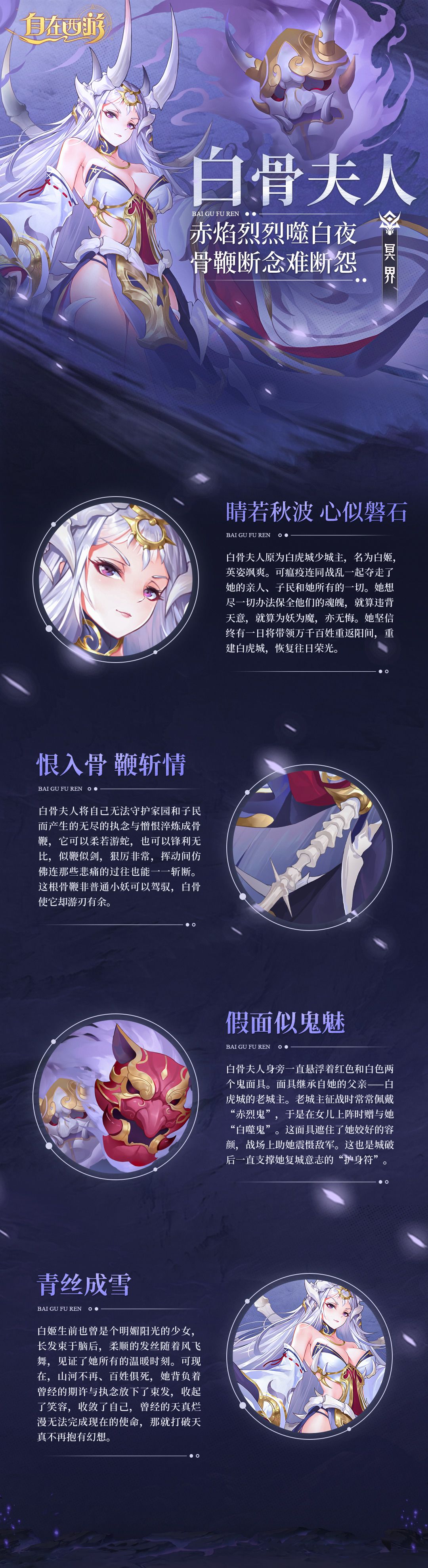 白骨夫人的来历很少有人知道,她像是凭空出现的怪物,短短数十年便在妖界名声大振,甚至不知何故触怒天庭而遭天庭追杀。于是她将自己的身影藏进了深不见底的冥界,她知道这只是短暂的蛰伏——为了即将到来的那一天。