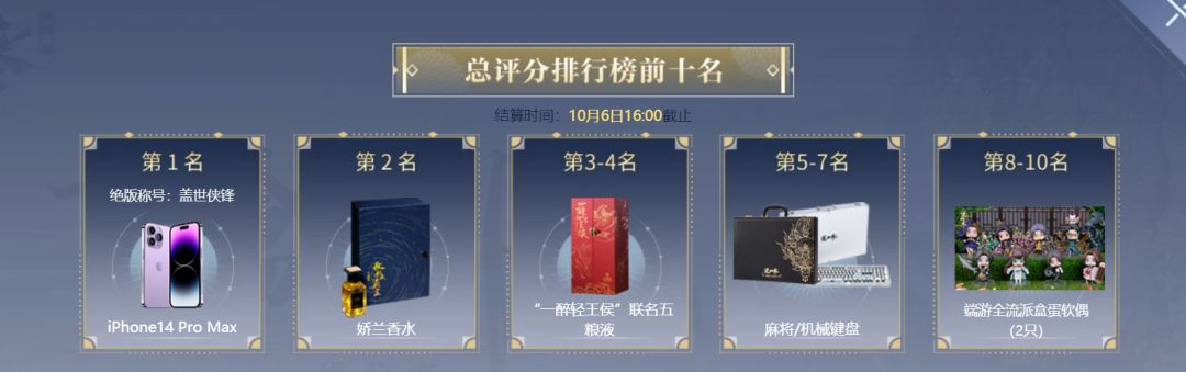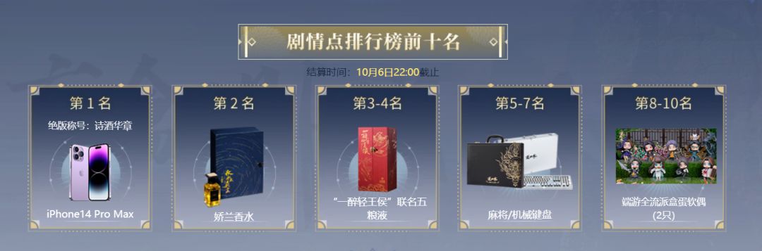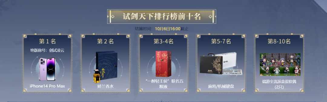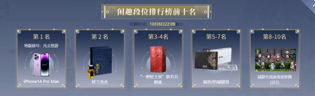 二 同时满足多个排名奖,只获得最高价值的奖励(iPhone14 Pro Max>娇兰香水>“一醉轻王侯”逆水寒联名五粮液>守心镇魔麻将/逆水寒定制机械键盘>逆水寒流派盒蛋)。