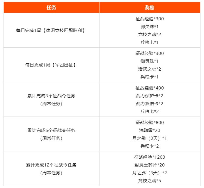 活动期间,完成相应征战令的任务,即可获得战力保护卡、御灵珠、封灵玉碎片等丰厚奖励!