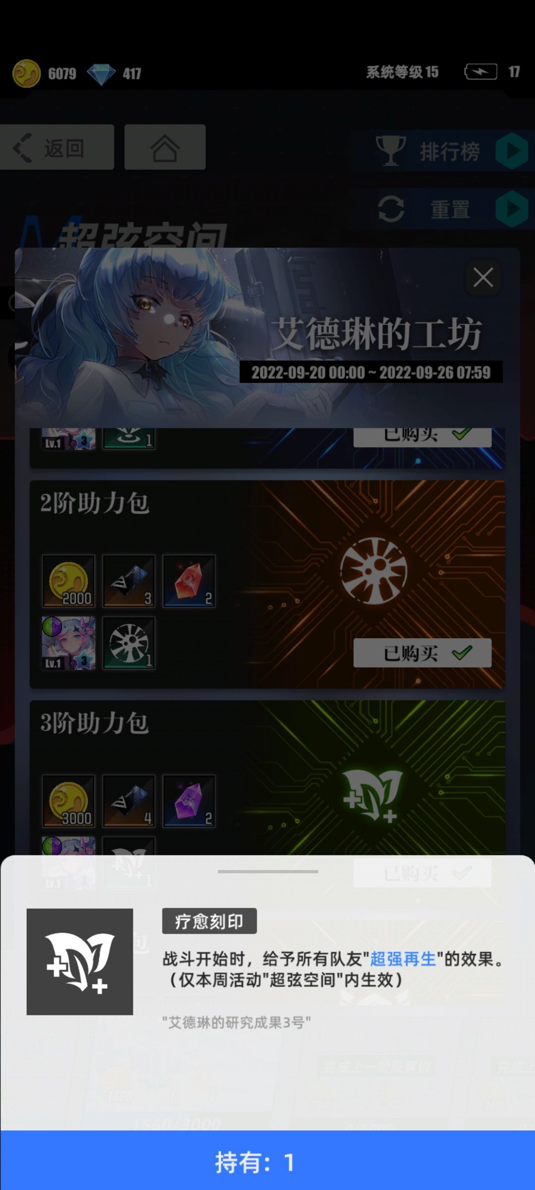 (如果想要打超弦空间,一定要记得买到第三个助力礼包,每回合回两点生命,这个真的很重要)