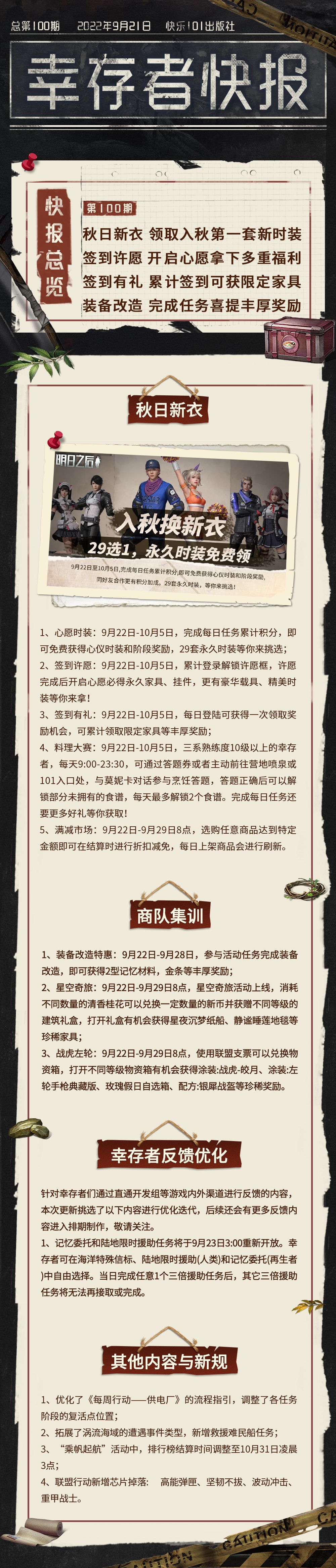 叩叩~最新一期的幸存者快报已送达,快来抢先查阅本期的更新内容吧~