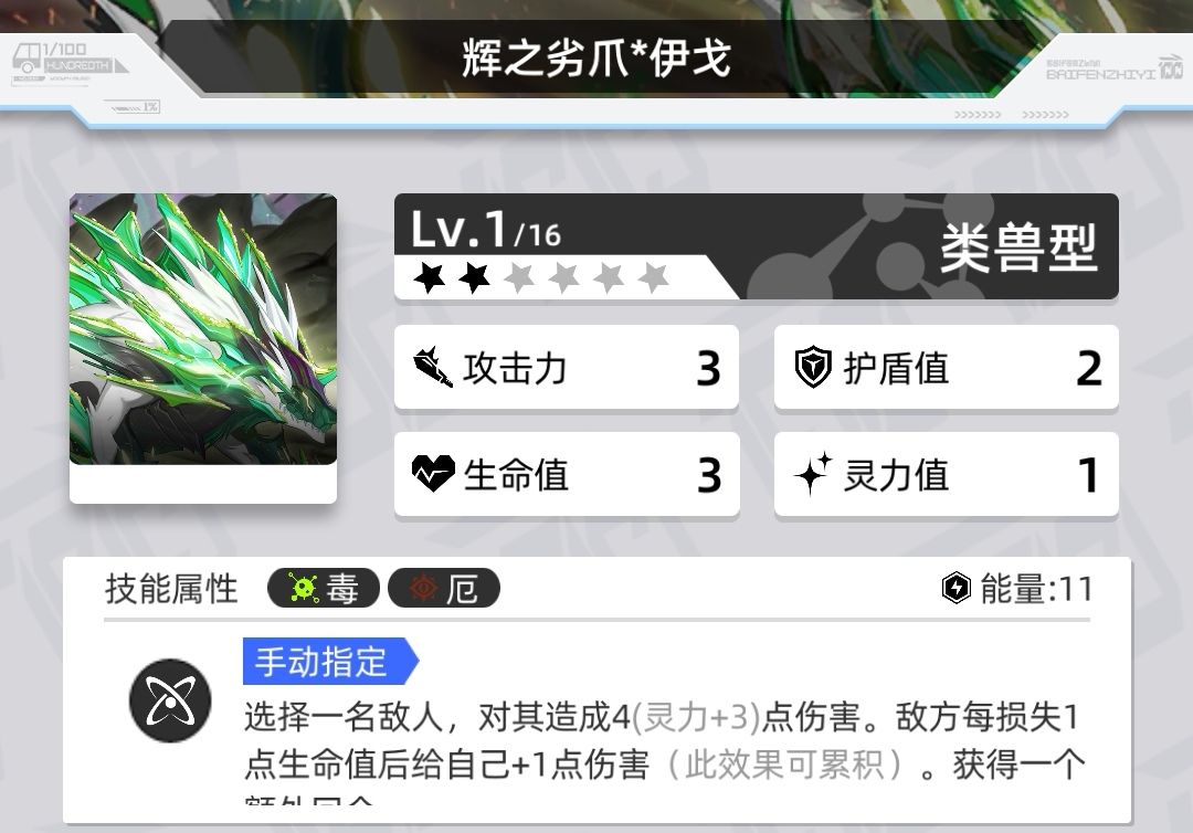 最后是狗,原来我没有注意狗的文本描述,后来到处找有额外回合的,就找到了这个和毒诺伦。这个狗的输出能力在局内是能成长的。诺伦虽然消耗低的输出能力有限,这个打高血BOSS越打伤害越高。