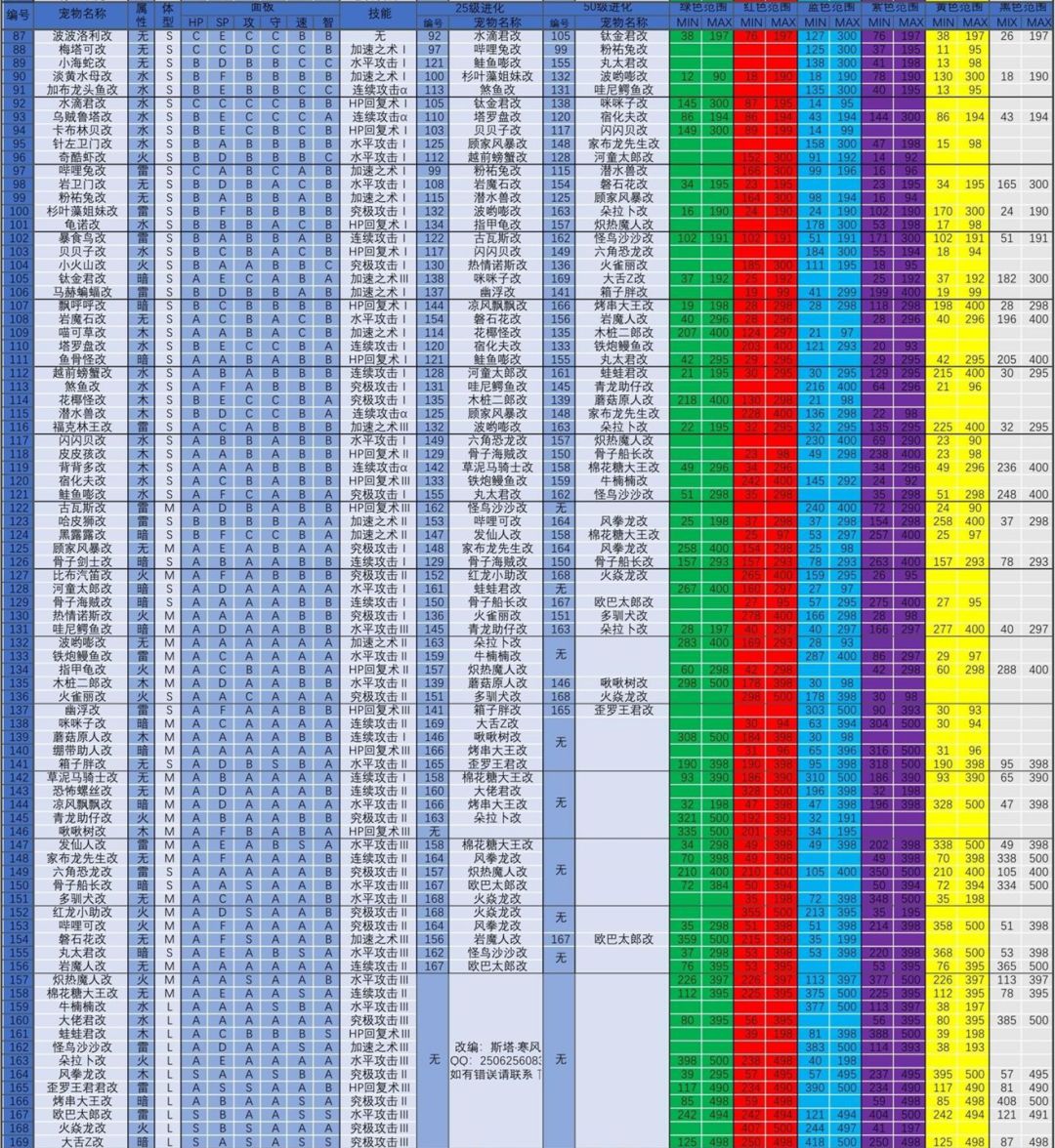 宠物在25级和50级会进化(某些宠物不会进化),进化表和色素表在下图。