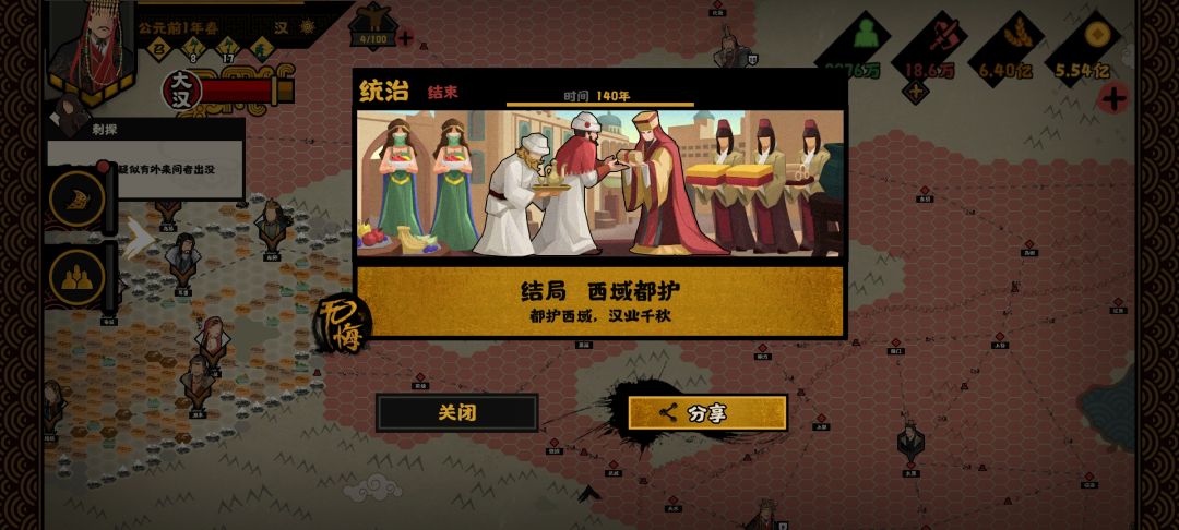 花了我一百多年时间不和亲终于打过了,本来还想留着匈奴不决战,等着把整个西域完全踩干净然后把狼居胥山拿下就匈奴远遁了。没想到系统自动给我算了和西域都护结局。