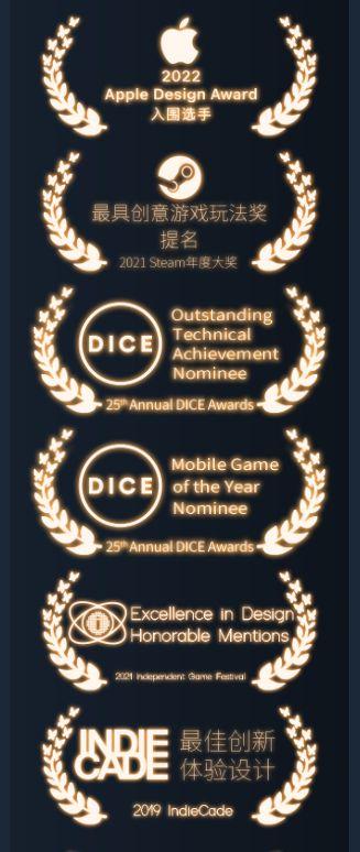 游戏从公布到现在,各种官方奖项也一直拿到手软:苹果设计大奖入围、Steam最具创意玩法提名、2021 IndieCade最佳创新体验设计奖,在Steam界面上一张图都截不全。
