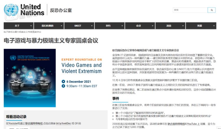 2021年12月,联合国反恐怖主义办公室(UNOCT)召开了一次小组讨论会,意在警告一项新出现的“恐怖主义威胁”:极端分子正在利用网络游戏,使在线游戏社区的成员变得愈发激进。