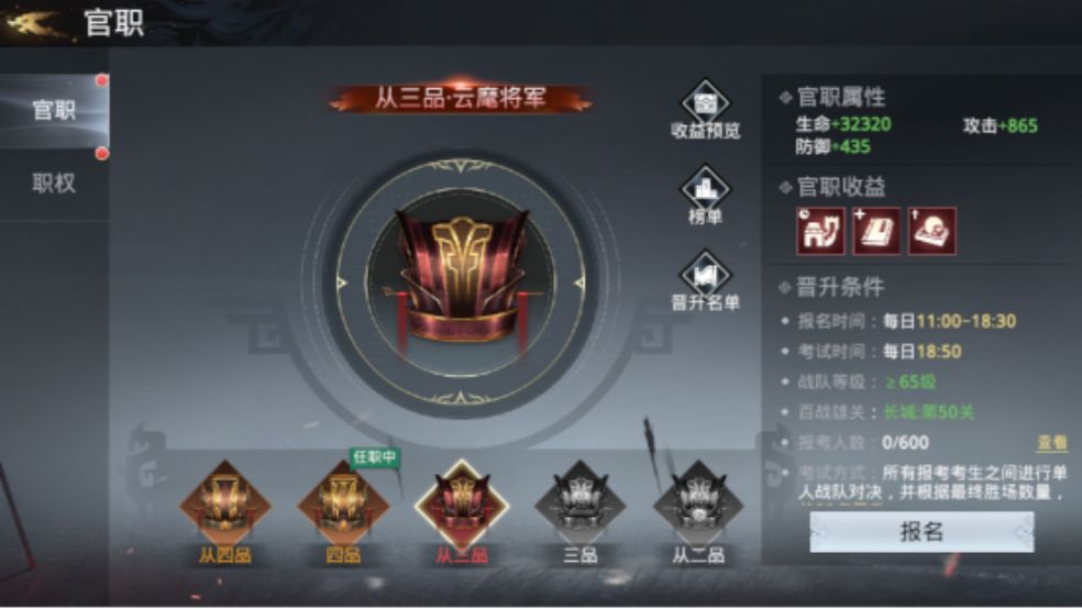 战力提升第四式:官职系统,战力和权利双提升官职系统,不仅能大幅度提高战力,还可以增加百战雄关的挂机限和名将列传购买次数。此外随着官职的提升还可以享受一些职权带来的便利。