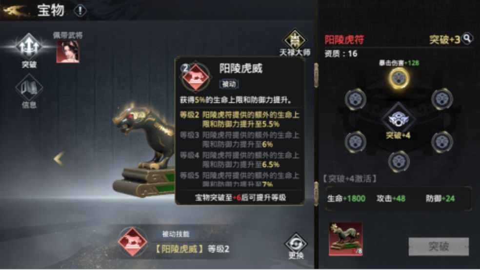 宝物与其他系统相比基础属性所带来的提升并不是很大,主要的是宝物技能为武将所携带的增益,宝物虽然没有专属,但是根据宝物技能的不同合理搭配是越战的关键。