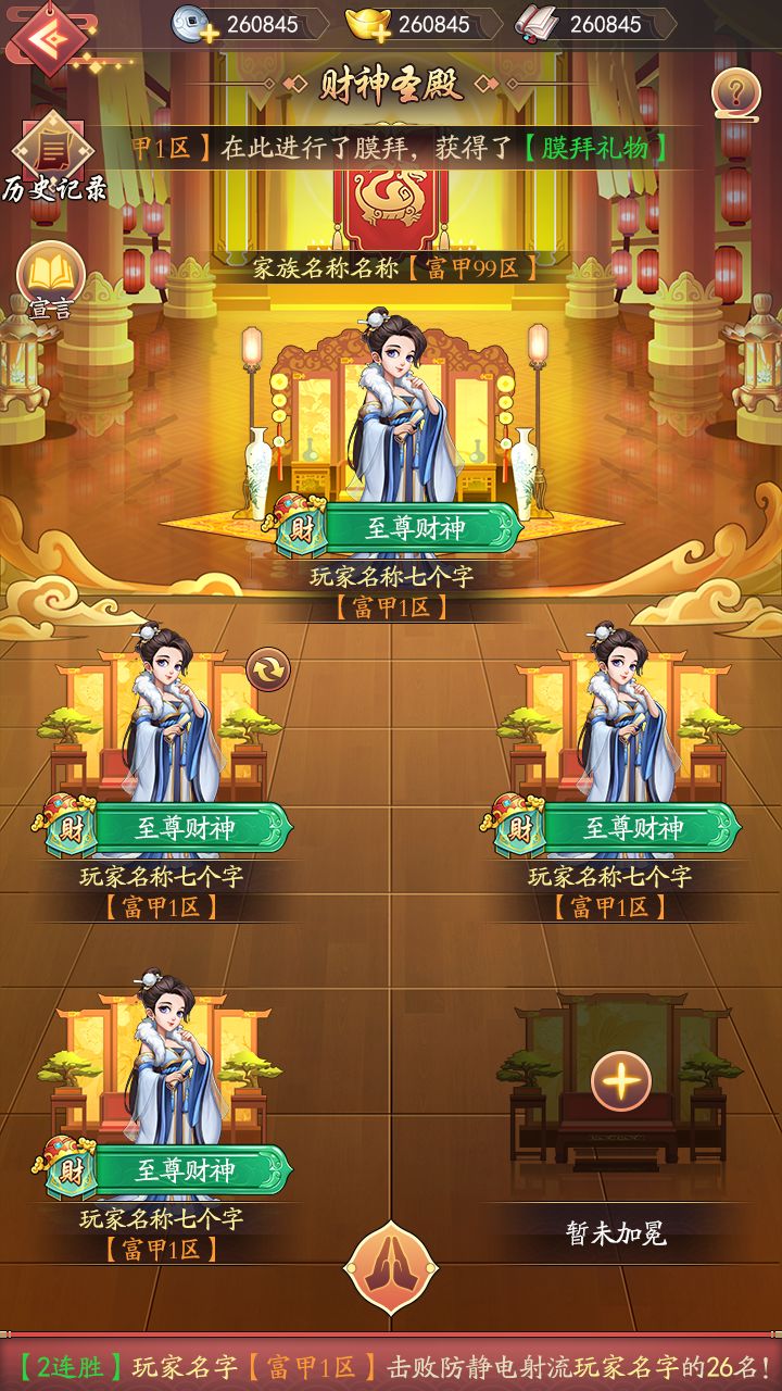 入驻规则:家族贸易战家族排行第一的家族族长获得【至尊财神】称号,族长可加冕4个成员为四路财神,每次加冕有冷却CD。入驻时长:本赛季家族贸易战结束至下一个赛季开始。