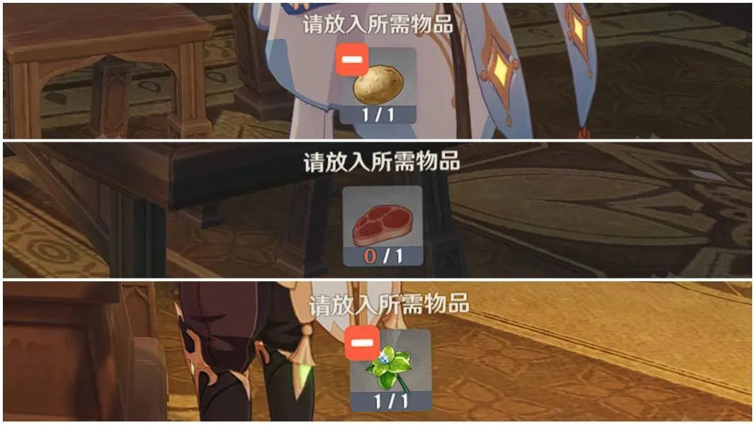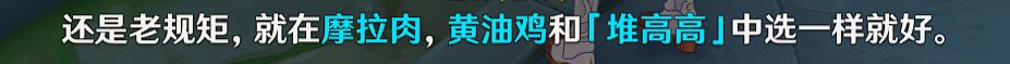 完成方法:选择一个吞金料理给哈特姆,提交摩拉肉,黄油鸡,堆高高三者任一即可(后续和提交料理无关,我个人更倾向全随机)