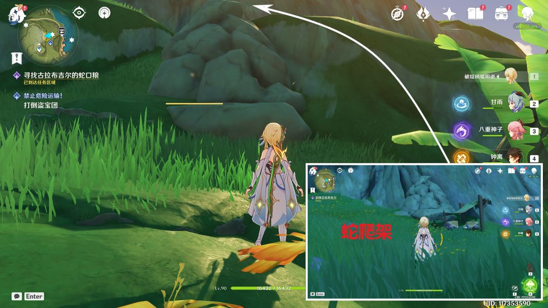 (2)巨石下有蛇爬架(击碎巨石后,在西边的巨石下面刷新)