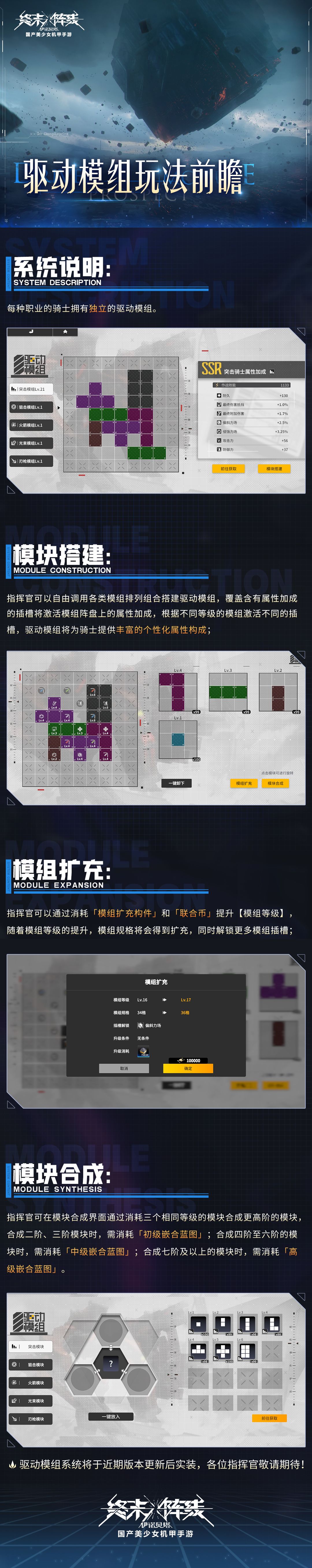 尊敬的指挥官:本次为大家带来即将上线的玩法系统——驱动模组的前瞻介绍,该系统将于近期版本更新后实装,具体内容敬请关注后续官方公告,欢迎各位指挥官在新版本中进行体验!