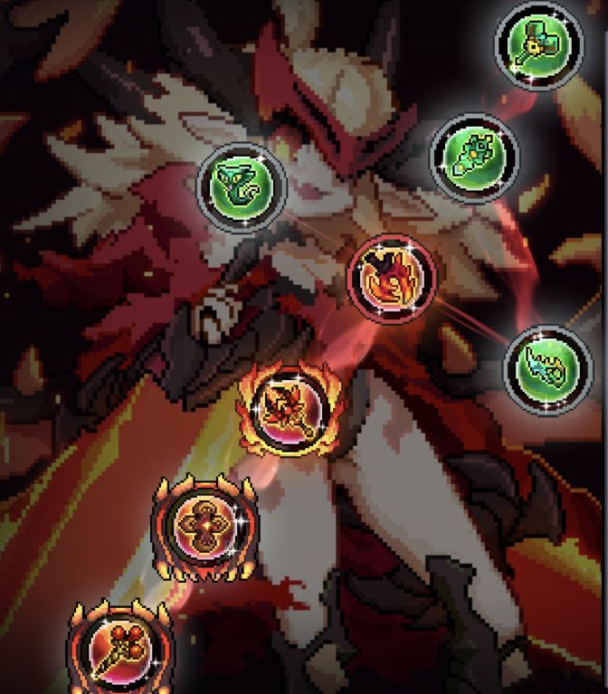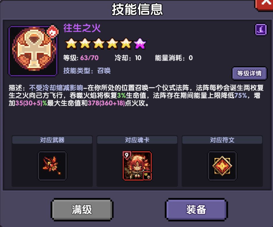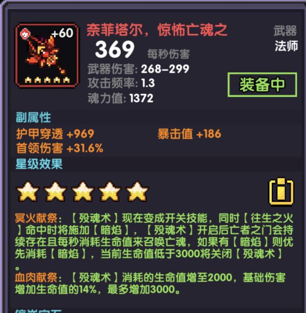 分两点说,第一点:因为武器效果,橙技能变成开关技能,而后会因为紫技能加成并且变成消耗生命攻击敌人的死灵魂法,暗焰越高,伤害加成越多,对自身反噬也越高,生命过低就和蓝量过低一样,关闭橙技能。