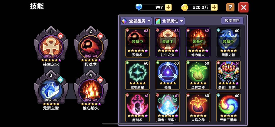 ③技能方面。橙技能简单易懂,紫色技能加生命火攻,但是副作用降低75%蓝量,导致头没办法用耗蓝头,要不然直接一个技能负蓝。
