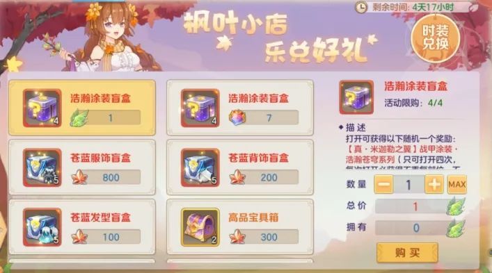 ✦营业内容:使用丹枫、时光彩钻等兑换以下珍稀道具:浩瀚涂装盲盒、苍蓝服饰盲盒、传说限定卡牌包、红色闪星符印、最强狐音、真·超能战甲等。