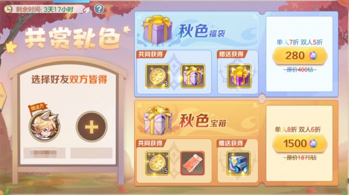 ✦活动内容:单人购买、享单人折扣,选择好友后购买享双人折扣、双方均获得礼包,赠送方还有额外奖励相送~福袋&礼包内容涉及暖阳币、半价十连券、凤凰勋章宝箱、苍蓝头饰盲盒~