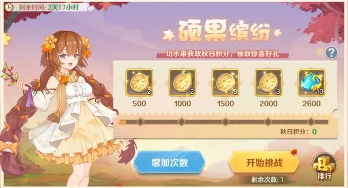 ●活动内容:消耗挑战次数切水果,每局获得秋意好礼与秋日积分,进而获得暖阳币、幻想灵珠等奖励,还有每日排行榜奖励结算噢~内含远古藏宝图等好礼呢!