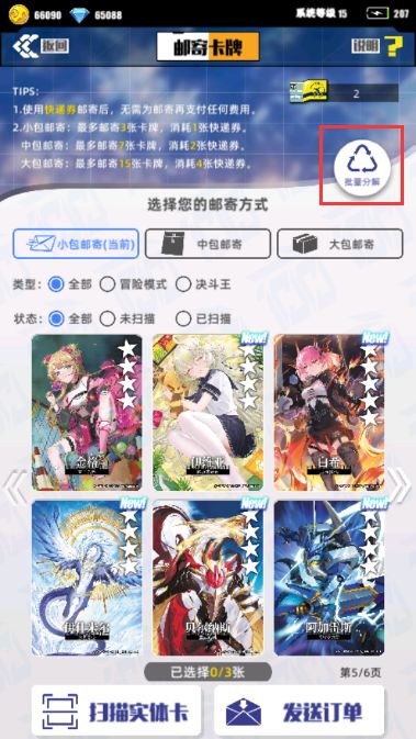 五维商店-邮寄实体卡页面可以找到批量分解的按钮,分解可以得到系统升级/基建设施升级所需的系统数据,分解并不会让你这张卡本身消失,对于一些你不想邮寄的卡,直接拆掉就可以了,如果你一分钱都不打算氪,全拆了都无所谓,因为盛总说过了,以后不会让人白嫖快递券了。