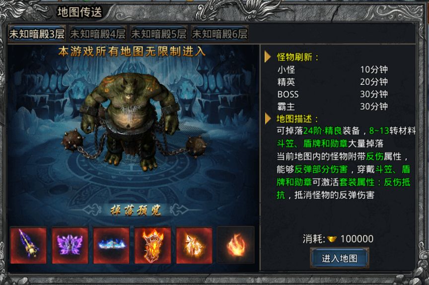 未知暗殿的BOSS吸收了日月精气,拥有了斗转星移的能力,身体具有反伤特性。受到伤害可将反弹部分伤害至攻击者,同时也有着极高的斗笠、勋章、盾牌神饰的掉落概率!提高自己的斗笠、勋章、盾牌等级可忽视BOSS的反伤能力!