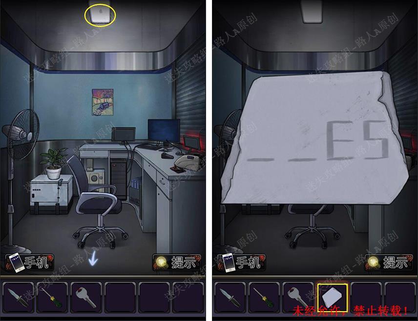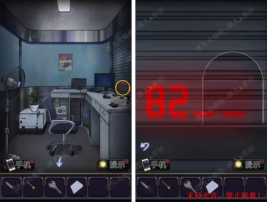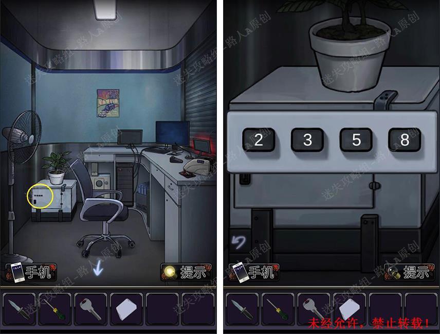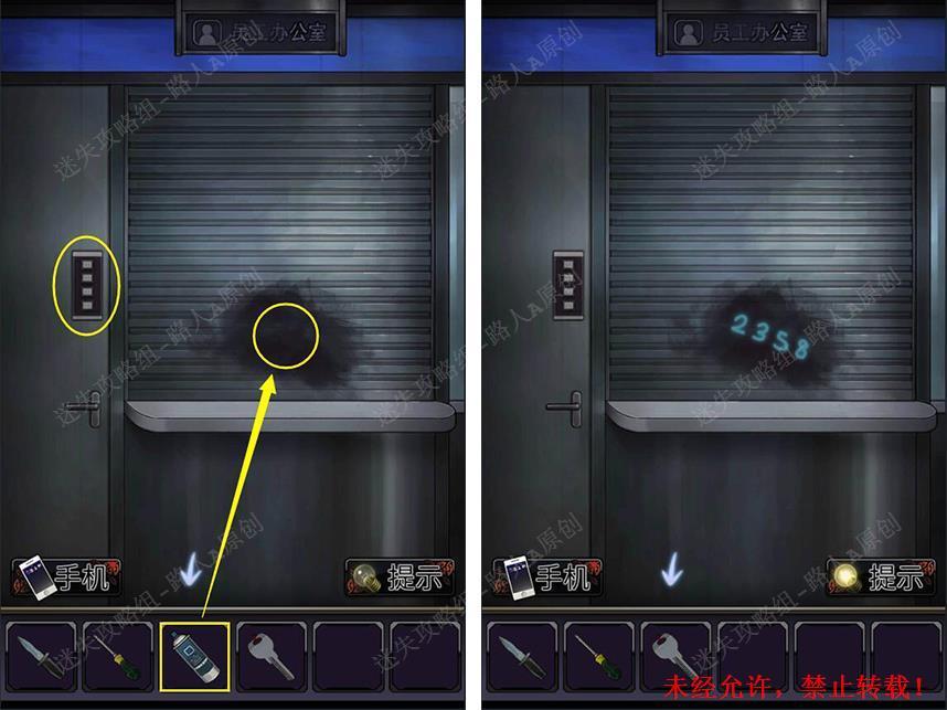 30.打开灯罩拾取【纸条】,结合纸条和卷帘门的线索,得到密码【2358】。