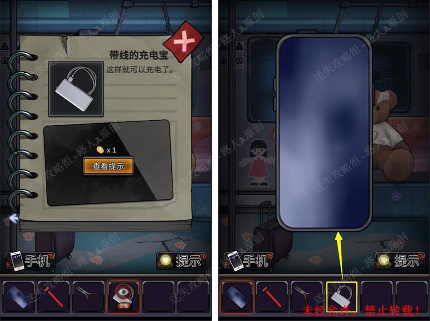 1.拾取【手机】、【充电线】、【小剪钳】、【充电宝】、【安全锤柄】。