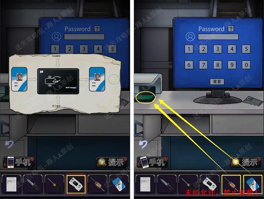 13.查看物品栏的【纸条】,用【电子元件】修复读卡器,再将【空白的员工卡】放入读卡器。