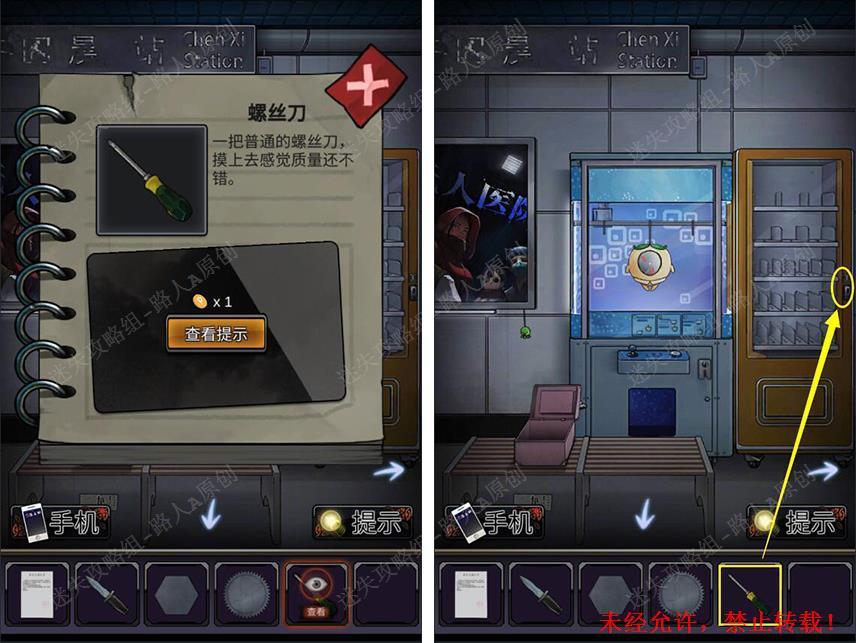 11.组合【螺丝刀刀柄】和【螺丝刀刀口盒】,用【螺丝刀】拆开自动售货机的投币口,拾取【电子元件】和【纸条】。