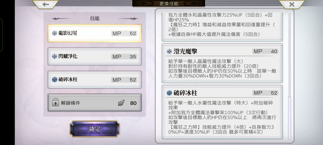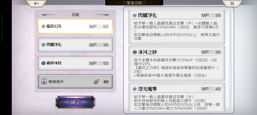 【闪耀净化】单一敌人晶魔中+全体敌人晶&水耐25%down(3回合,最多累积四次,即最高62.5%)+攻击后目标hp仍在50%以上,则追加攻击
