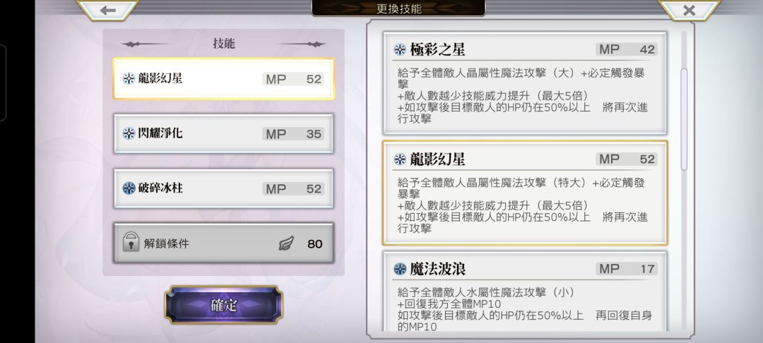 固有技最终形态——【龙影幻星】全体敌人晶魔特大+必爆+敌人数目越少伤害越高(最高五倍)+攻击后目标hp仍在50%以上,则追加攻击