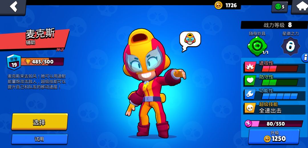 对于远程脆皮来说,控制距离是头等大事。许多射手的速度比坦克慢,所以要更加慎重,麦克斯的移动速度非常快,能够轻易的与其他英雄拉开距离。开大后还能得到大幅的速度提升,无论是对队友或是自己,都能起到较不错的功能性作用虽然我觉得换上个爆发型技能,麦克斯会更强,但全体加速毕竟也是《荒野乱斗》独一份。