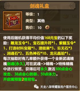 使用后随机获得平均价值168元宝的以下奖励:雕龙玉令*1、宝石提升符*1、紫髓玉令*1、打造材料宝箱*1、潜能果*3、忘无石*3、润魂石*2、五色神石*10、龙元晶珀*1。每次抽取时有几率额外获得一个全新武魂精魄:剑魂(永久)