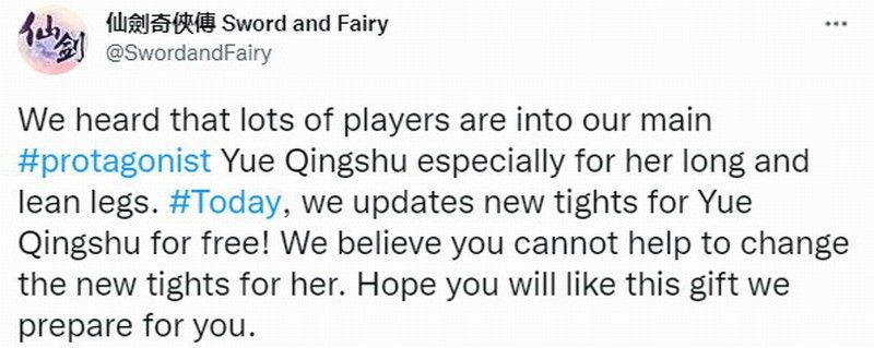 近日仙剑官方在推特上发文称:“听说许多玩家喜欢女主角月清疏,特别是她那修长的美腿。现在我们免费为月清疏更新了新的丝袜!相信你会忍不住为她换上,希望你能喜欢我们为你准备的这份礼物。”