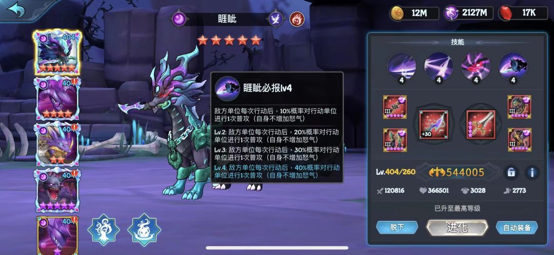 偶然过66图的时候体验了阿托夫的变态,偶然机遇下发现睚眦能一回合秒阿托夫(概率学),睚眦秒阿托夫的提前主要是依赖的第四技能(狴犴必报)就
