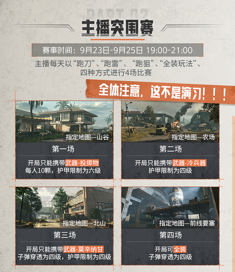 第二场,指定地图—农场,开局只能携带武器-冷兵器,护甲限制为四级;