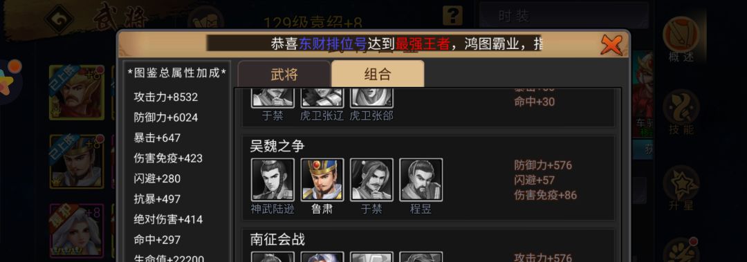 单图鉴,鲁肃加防御150,程昱加攻击150,于禁加生命值750,神武陆逊攻击加150,单图鉴相当于加了300攻击和150防御还有750生命,这点来说数据还是相当不错的。