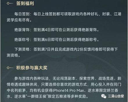 绝版称号:签到满6日即可在公测后获得绝版称号。2、下测资格:签到满7日并且完成游戏内2份反馈问卷即可获得下测资格;获得首测资格的少侠记得保存测试期间每天登陆游戏,同时完成2份反馈问卷,这样下一次开测你不用抢就有资格了。