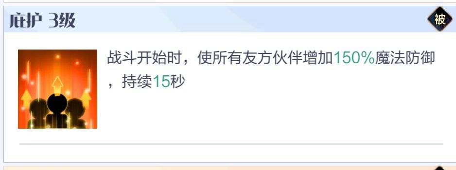 核心技能,算是补充前排坦度,战力相当的情况下能让自己比对面前排顶更多时间。