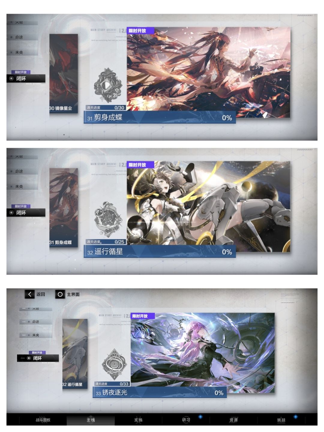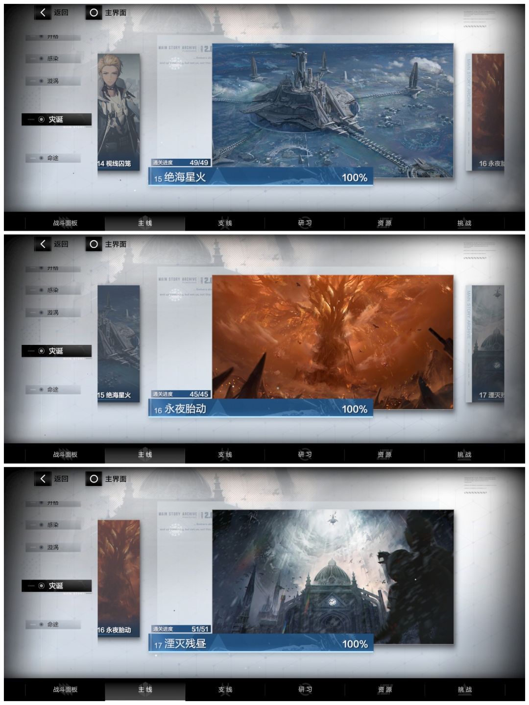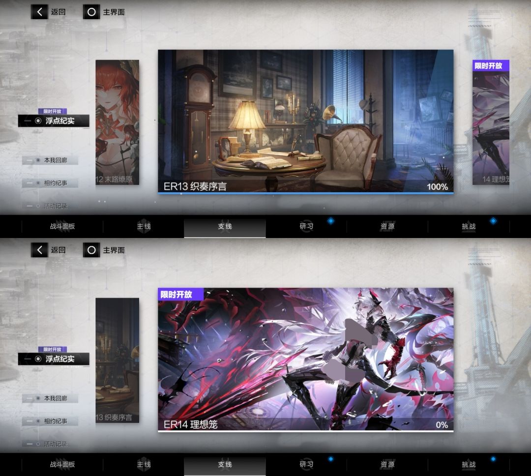 ps:常驻玩法:挑战——多维演绎——宣叙妄想(赛琳娜·幻奏的剧情)在17章后出的,但对主线影响不大
