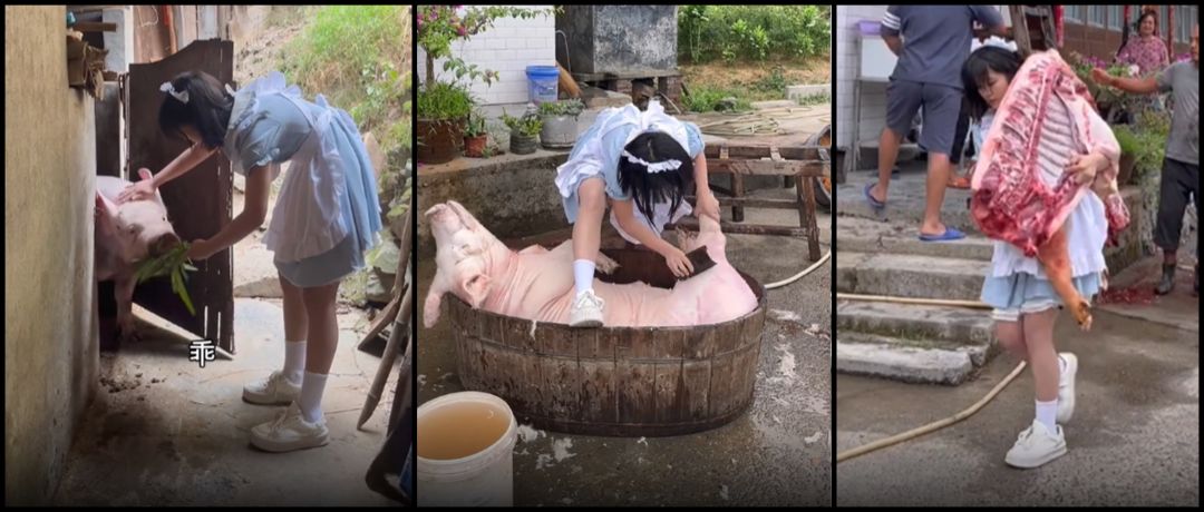 当你已经酝酿好所有恶毒词语,想好怎么喷视频里的女仆摆拍,却又被她扛在肩头的猪仔吸引了目光。