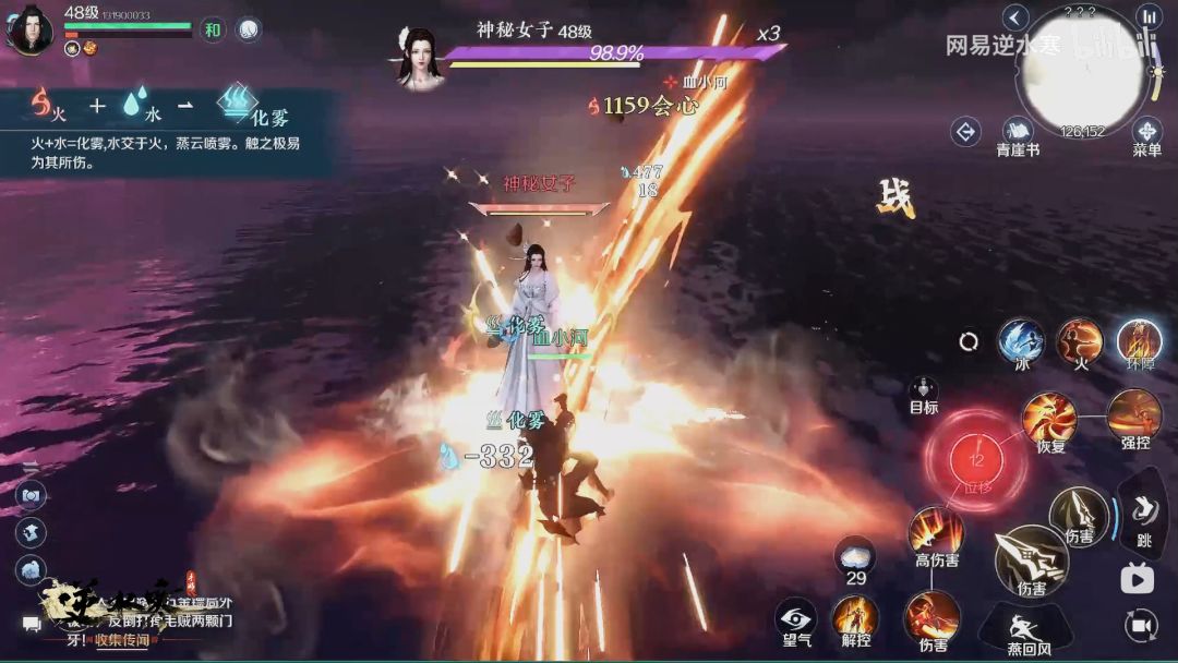 该图为演示中出现的人物状态,可以肯定的是,逆水寒手游一定有元素反应的机制,并且该机制对BOSS及玩家角色均有效,例如在雨天和湖面场景下,BOSS和玩家身上均有不造成伤害的“潮湿”状态,在玩家对BOSS使用火系技能时,BOSS会同时产生水火双属性的伤害,并根据火焰大小持续时间减少自身潮湿效果。