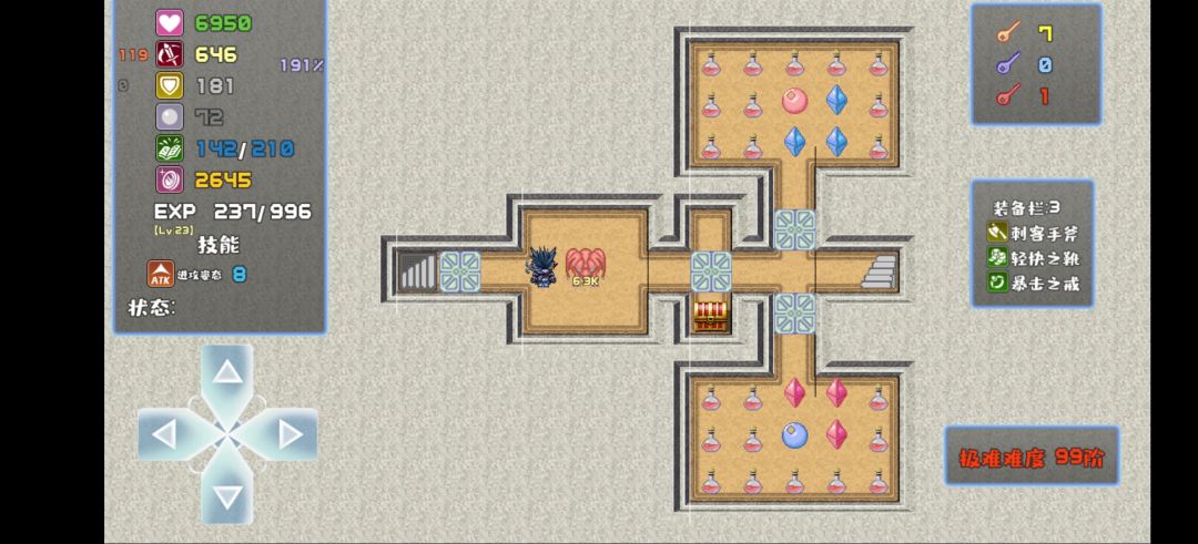 第三区商店不管,直接往前冲蓝多的路上隐身偷宝石,硬钢史莱姆拿暴击戒指,打红武士拿宝石等等都自己规划,我还拿了回复戒指。等拿到破防技能基本稳了一大半了。有一层有冰的注意,刺客打怪会出现在怪物身后,这个时候是可以站在冰上的,所以只要走中间的路用破防打掉黑史莱姆,就可以直接往右先去下一层,然后再传送回来拿宝石。第三区应该比较简单,一般破防打怪都是500血以内。自己研究去吧,毒怪全部不杀。