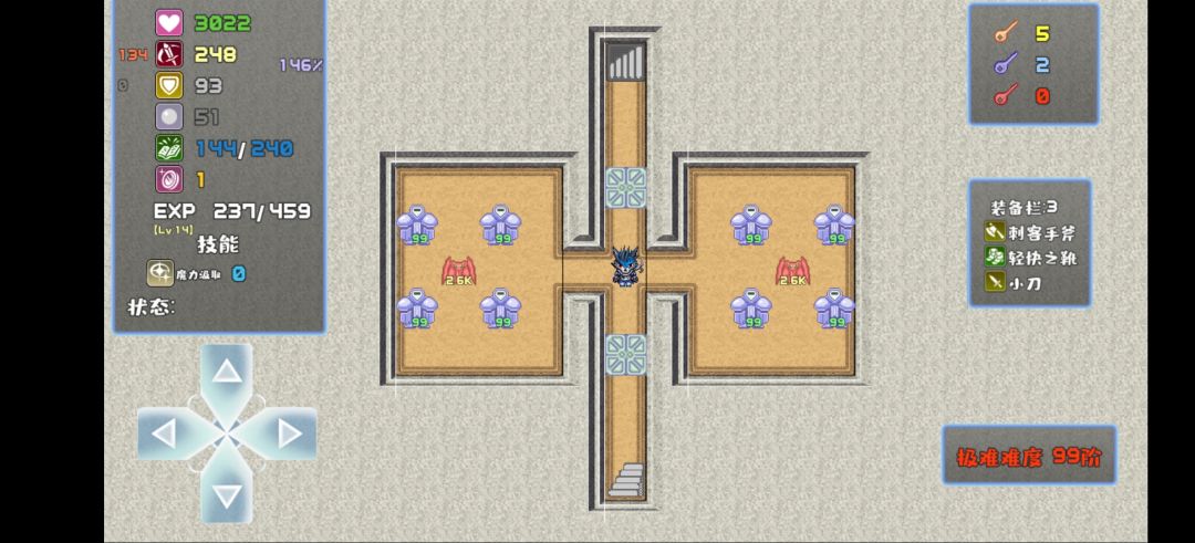 打完第一个boss进入第二区,隐身过掉拦路的绿毛人然后隐身进商店上面石头人,找老头加攻击。然后硬刚到商店加攻击总共加6次(懒得自己去研究了,就6次吧)。然后往上硬钢石头人拿蓝宝石,回头杀红卫兵拿红宝石,快升级的话就找怪升级,再往上硬钢石头人。去隐藏房开一个蓝门(尝试过不开,结果boss没打过,但也没仔细研究反正能过就行)。回头杀第一层留的怪攒50蓝去偷武器。因为最后黄钥匙不是很缺,12层可以走近道省蓝(我没走,我比较抠到12层有100蓝)。14层隐身往上爬。15,16层自己看情况用技能打。加速不买,到17层拿第二个装备栏,然后等钱够再回去买攻速鞋子。被抓后出来下一层拿宝石,上一层技能不买推荐直接开黄门,攒75蓝偷宝石血瓶,然后回头低层宝石自己规划全部拿光。等攻击能上180秒骷髅后继续往上规划好路线拿宝石。打boss之前,我攒到了1200块19层隐身进去买了第三个装备栏。这里没用技能你们看着像是打不过,用技能后随便打。