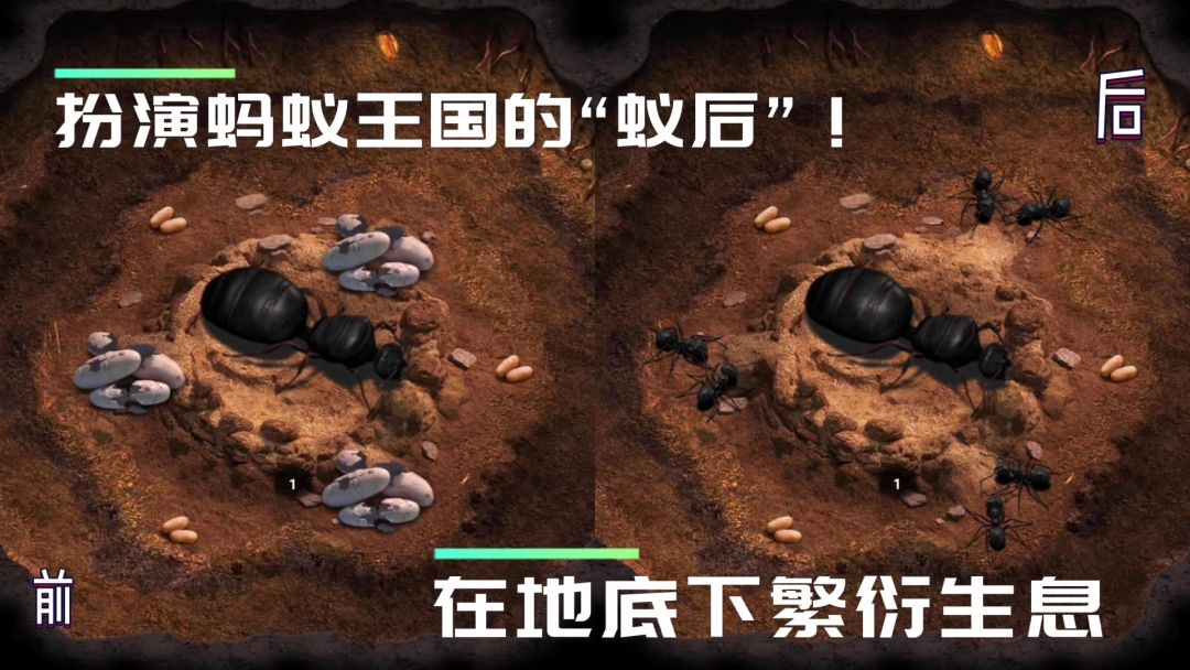 🐜《小小蚁国》是一款以“蚂蚁”为核心题材的SLG产品。我们要扮演这个蚂蚁王国的“蚁后”,在地底下繁衍生息开拓土地,一步步DIY自己的地下王国🏰