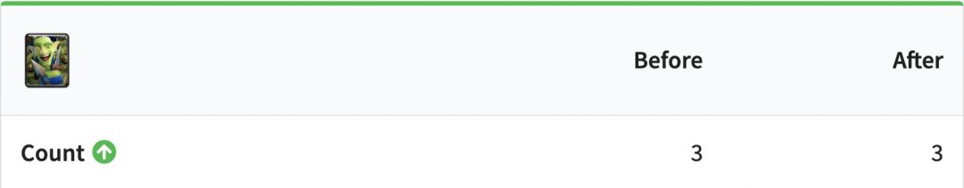 现在一次可以得到4只哥布林。这是很大的改动——哥布林从很久以前就一直是3个单位。现在改动的原因大概率是因为最近它的使用率非常的低。有了这样的数据,哥布林终于可以和小骷髅一争高下了。