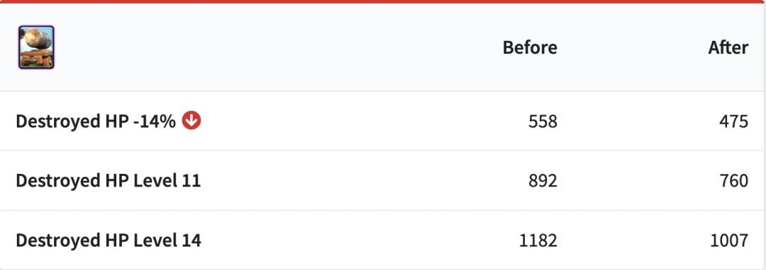 加农炮的使用率在最近几个赛季里有了质的飞跃,在很多速转卡组里担任不可缺少的防御位。【原文Cannon has seen a huge resurgence in recent seasons, making it the IT card for many cycle decks. 这个IT是啥意思啊,肯定不是常见的那个,但没有搜到别的。所以这句就按照猜想翻了,好听点就是意译:-I】调整后加农炮的生命值下降了14%,这样玩家们就会考虑别的防御建筑了。