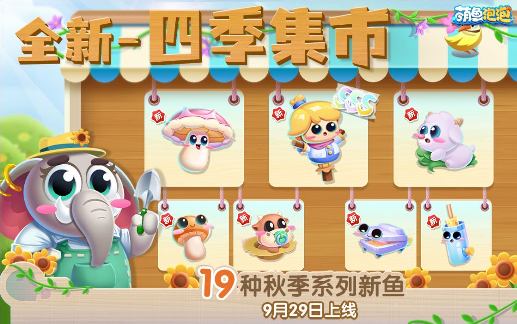 在这微风轻拂的秋日里泡泡宣布:四季集市将于9月29日开张啦!!秋日集市最先向馆长发起了收集邀请,集市里将上新19种秋季系列新鱼🐟,经过泡泡偷偷打听还与出游新岛屿相关哦~还有SSS级萌鱼上新等待收集,快来获取秋天的专属惊喜吧!