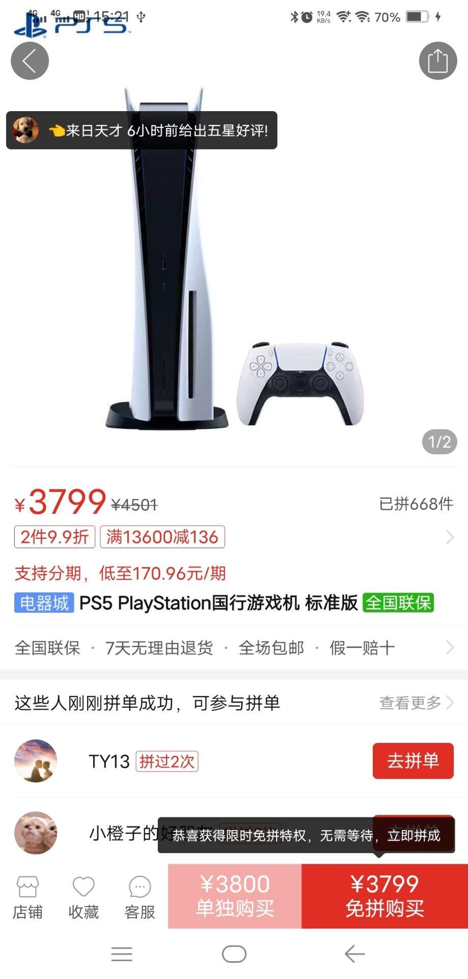 一个月后,今日,国行PS5在拼多多仍然能以低于原价的价格买到,3799元。想要以较低价格入手的朋友可作为参考。