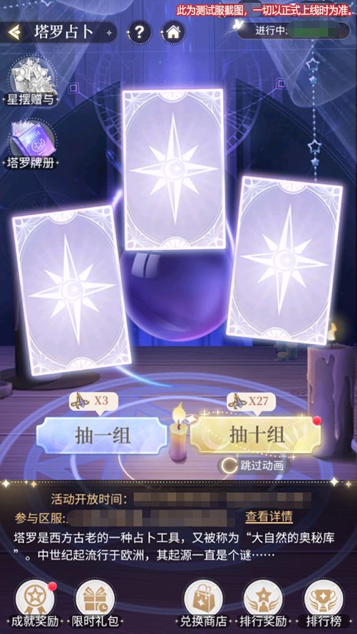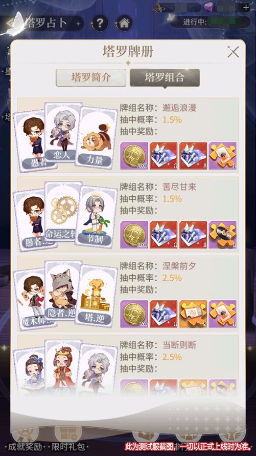 活动奖励:活动期间完成对应的塔罗成就,即可领取相应的成就奖励。成就奖励需要手动领取。每次进行神谕塔罗占卜可获得星币,活动结束后根据星币进行排行,可获得排行奖励。