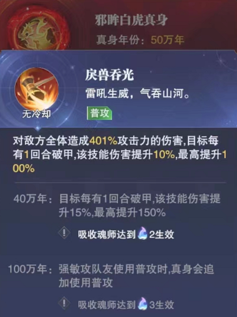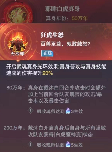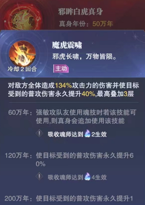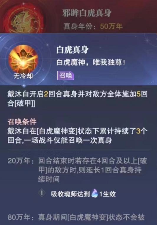 首先我们来看老虎戴沐白的真身效果,召唤条件为戴沐白需要在【白虎魔神变】下维持3个回合,这点对于很多战斗场景的限制就不小了,而这个真身则是可以持续存在的,而且条件似乎也并不是很难达成,而且召唤真身后本来就会给对方施加5回合的【破甲】状态。
