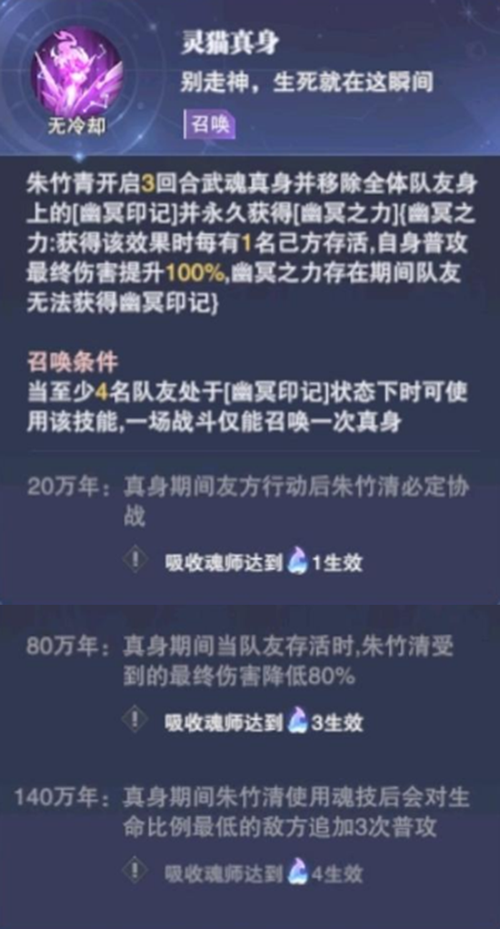 最后的真身光环效果则主要提升了真身在回合外攻击时的伤害。接着我们再来看看猫朱竹清的武魂真身4大技能效果: